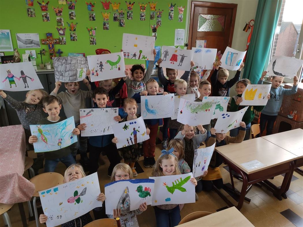 Leerlingen klas 1LC maken tekeningen bij het boek "De draak".