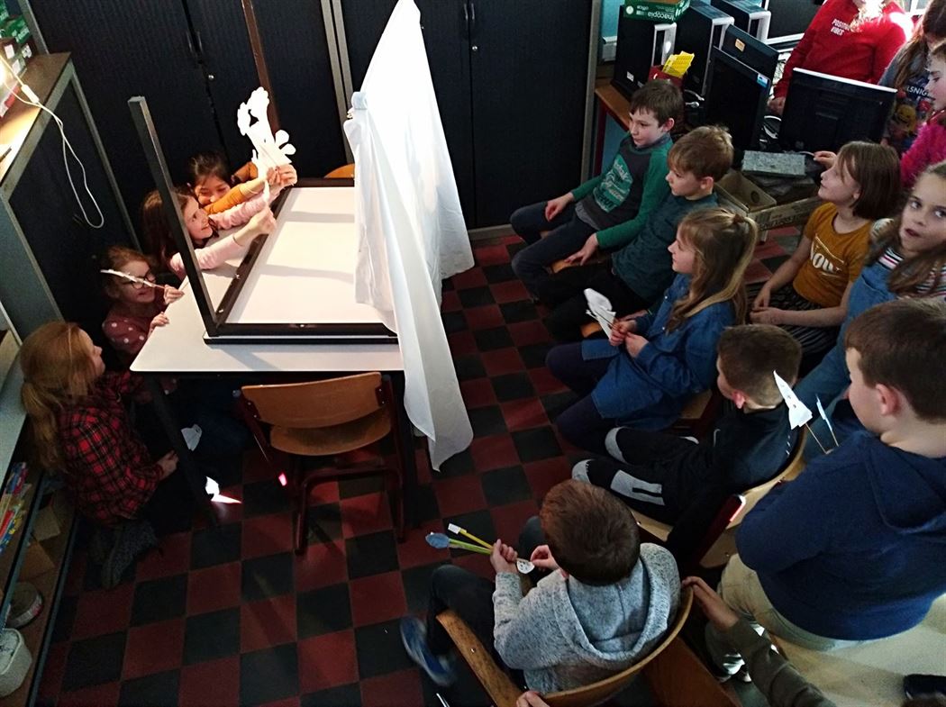 Bij een schimmenspel vertel je een verhaal aan de hand van schaduwen. De leerlingen knutselden zelf de figuren om daarna hun eigen verhaal achter een doek te vertellen.